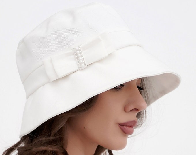 White Summer Hat – Linen Cotton Bucket Cloche for Women